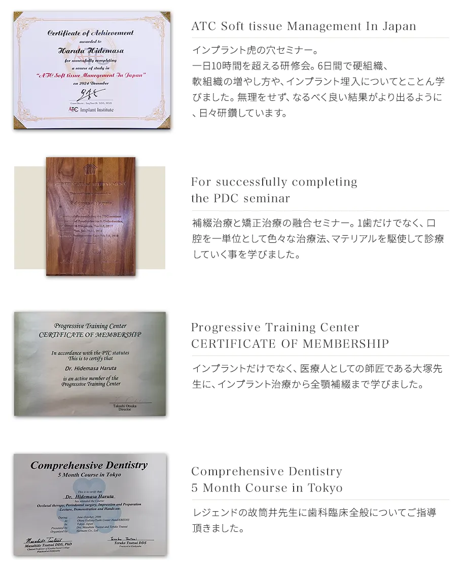 いつも丁寧に診察をしていただてます。色々な歯科医に通いましたが、技術的に素晴らしいと思います。某歯科系大学ではダメだった歯根治療が完治し、本当に助かりました。昨年インプラントもやりましたが完璧です!また良い歯科を探していた知人にハルタ歯科を紹介したところ、大変満足をして通院しております。先生はもちろんですが、受付やスタッフの方もいつも笑顔で親切に対応してくださってます。
